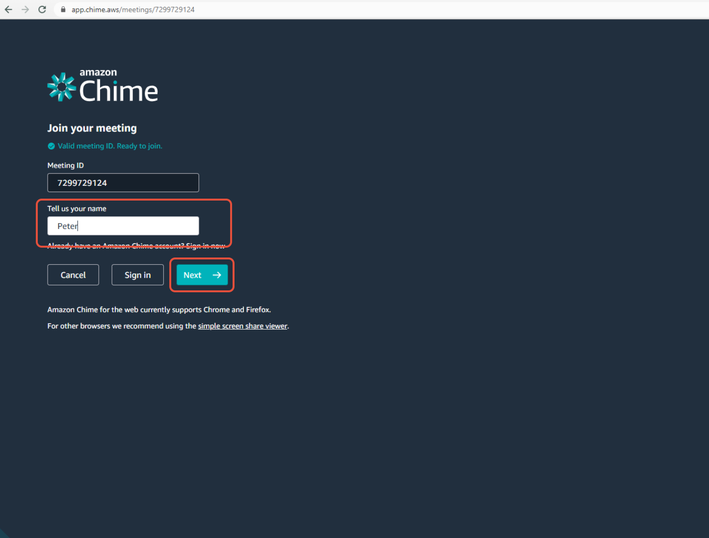 Opening Amazon Chime meeting in a browser
