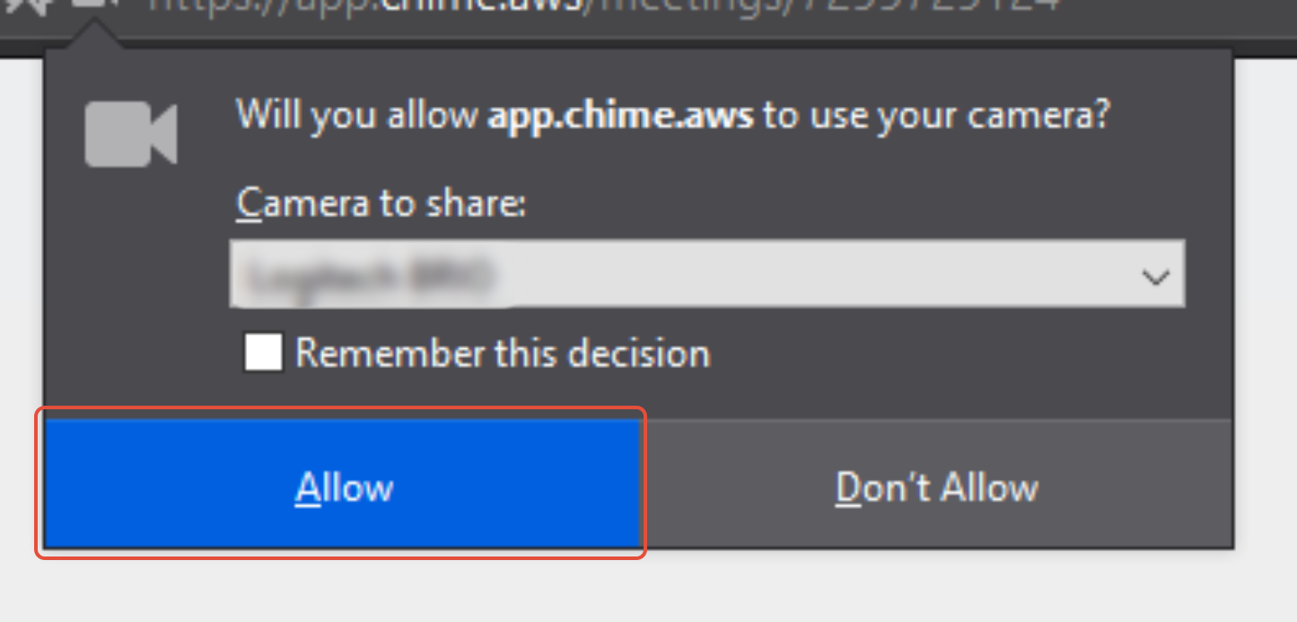 - To allow webcam usage, click on the Video button with the camera icon on the top of the meeting page. Another prompt will then show up asking for permission to use your webcam, click Allow.