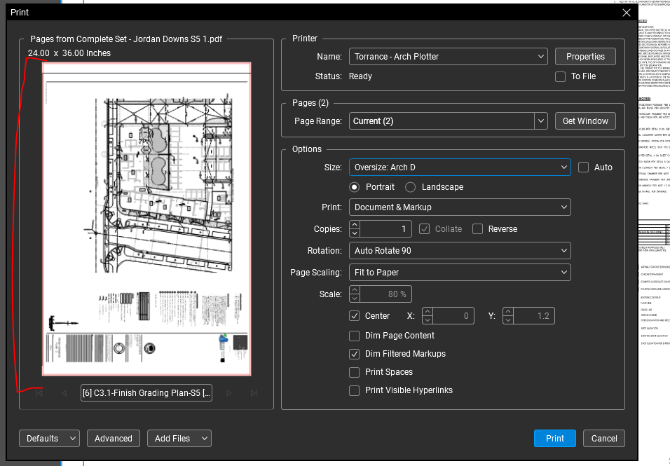 1. Open the PDF file accordingly using Bluebeam, go to print option ( Cntrl+P) then select "Torrance - Arch Plotter".