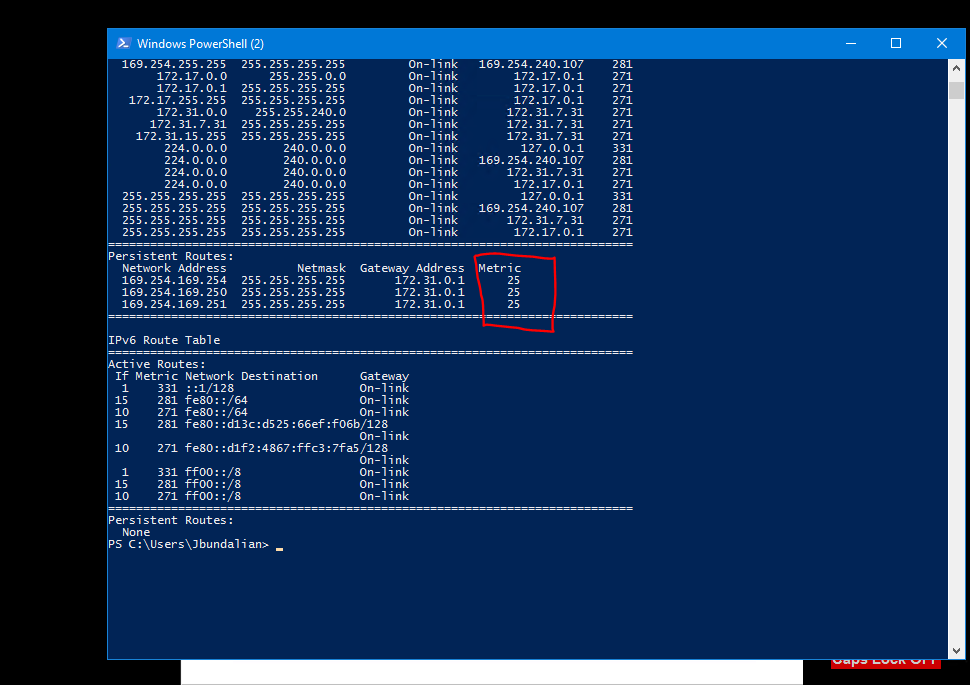 Run the command: “route print” and check the following route: