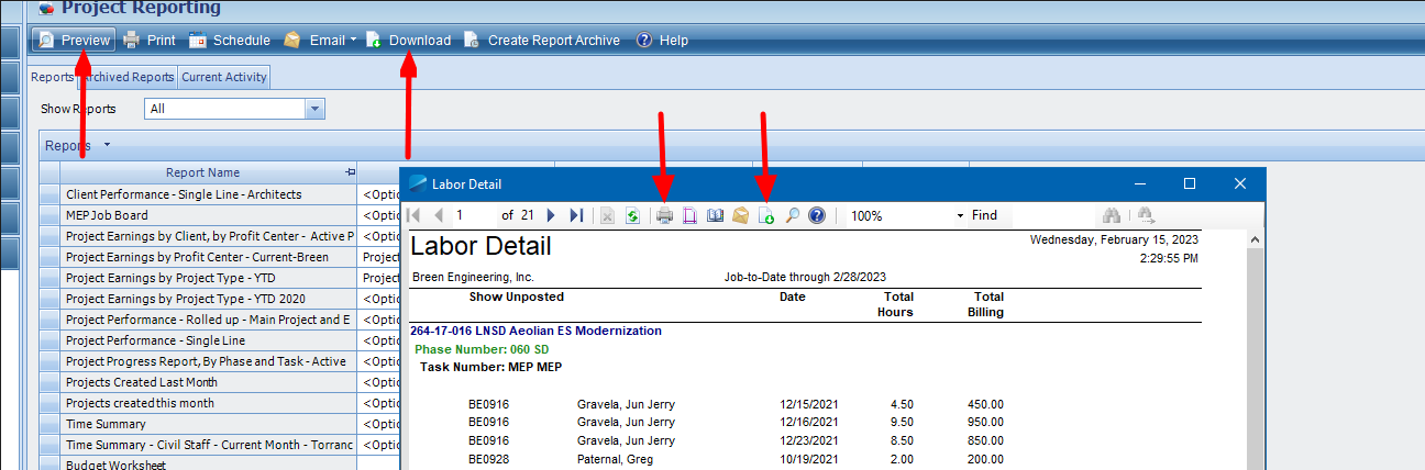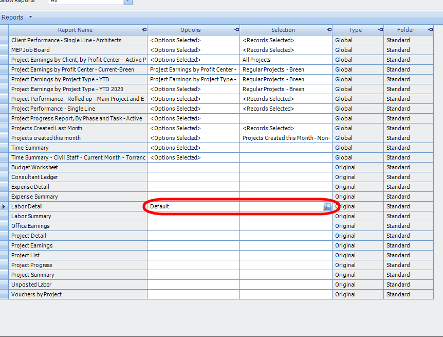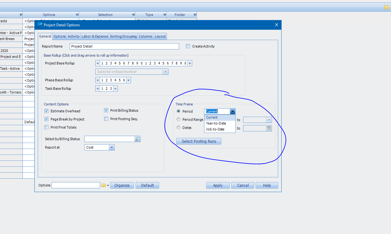- Go back to Labor Detail row and under options, click the triple dot button to open Project Detail Options window which lets you filter the data you want to look up. Click Apply after filling this out.