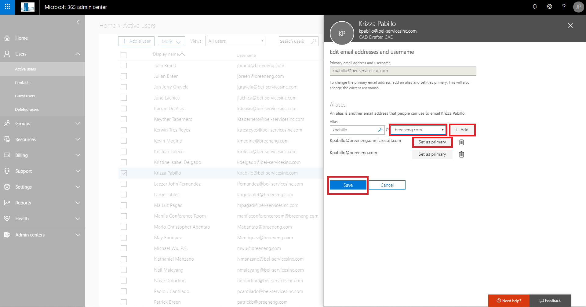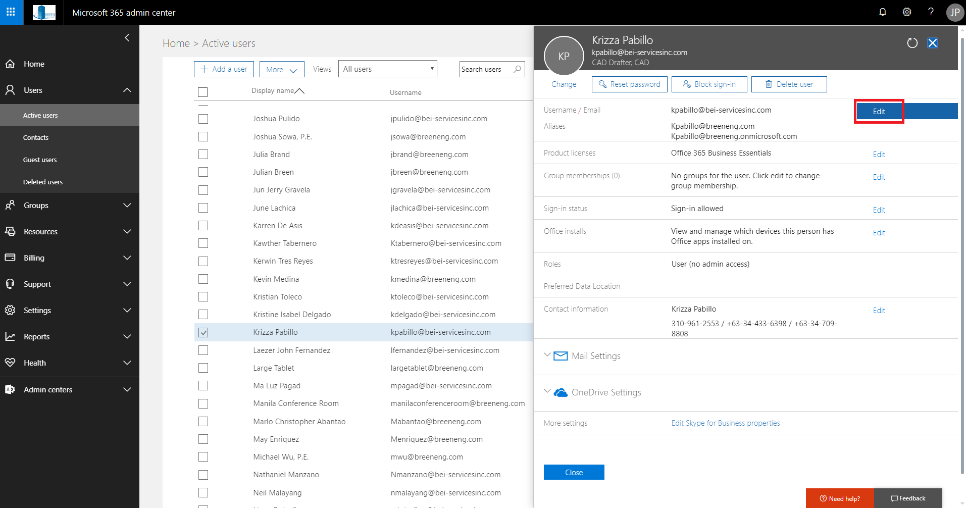 When creating an Office 365 account for new employees and you mistakenly use @breeneng.com or @bei-servicesinc.com and want to change it, follow this guide.