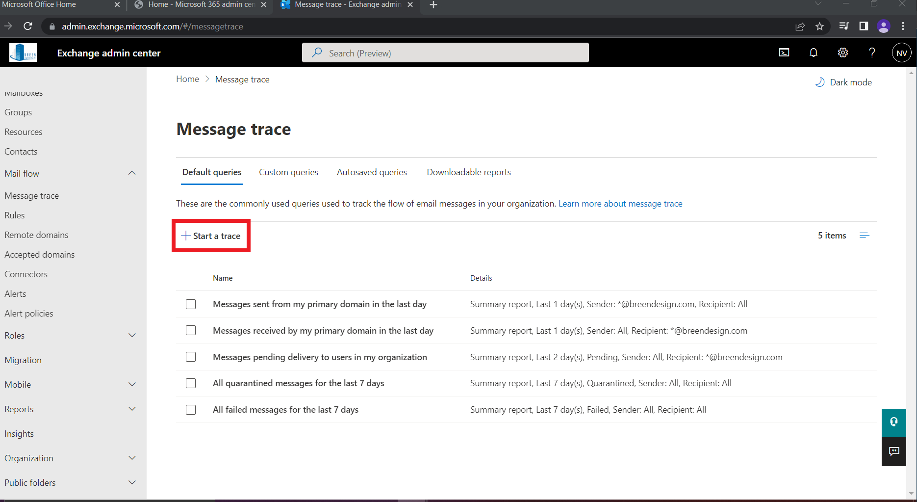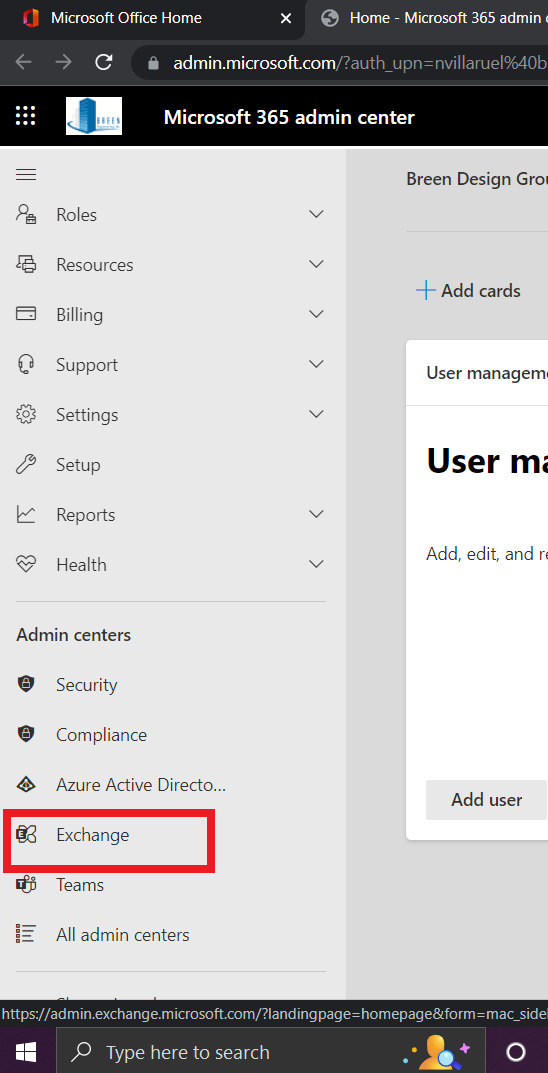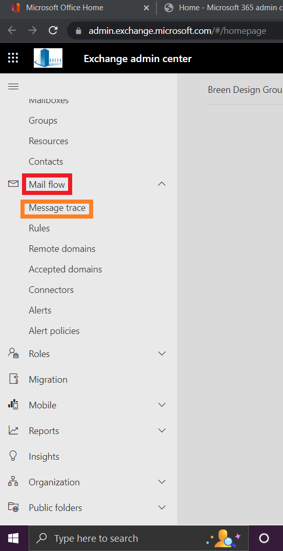 5. You're now directed into Exchange admin center. On the left side of the window open