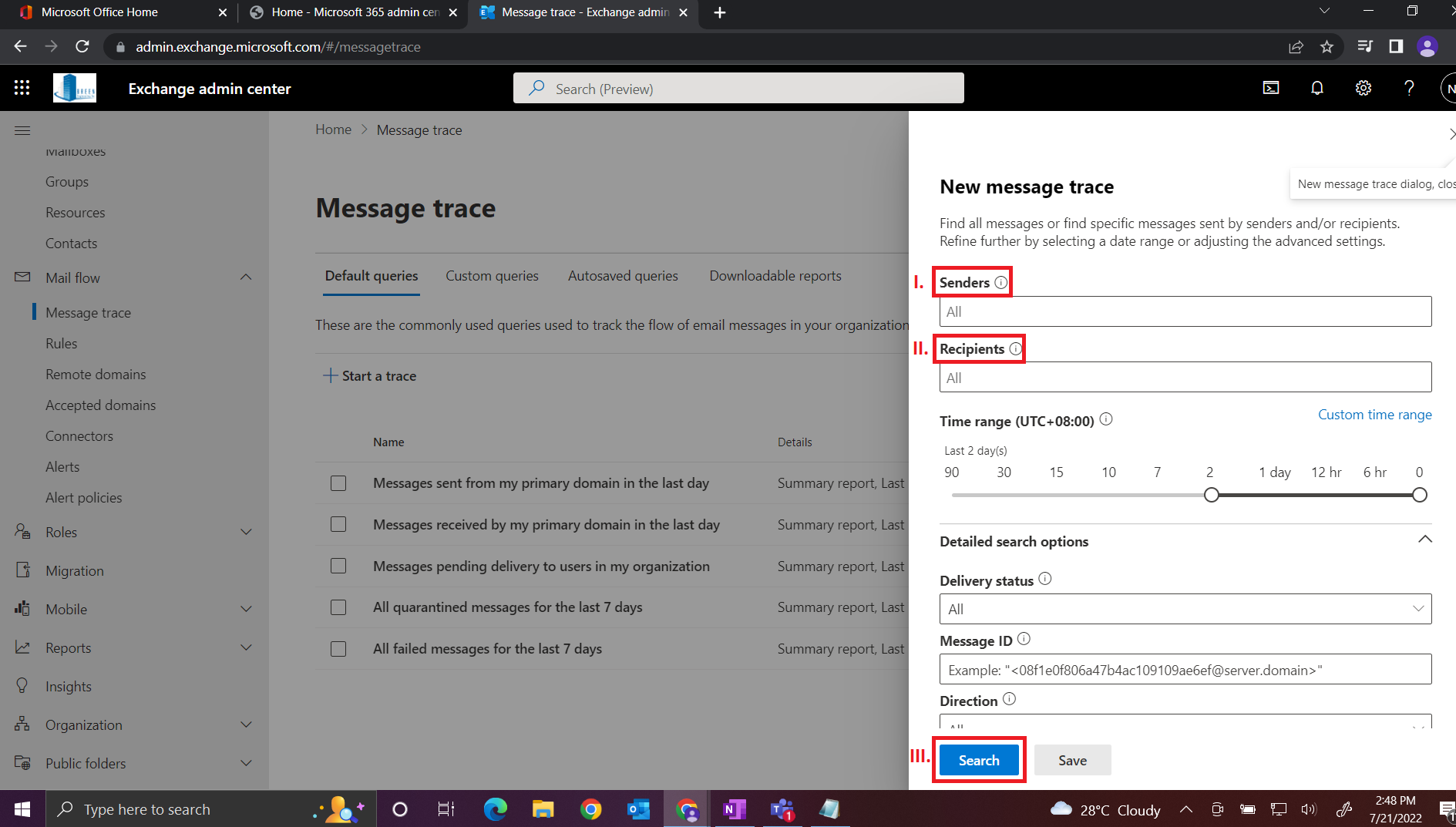 - If you're looking for an email that hasn't been delivered start a search in the Senders search bar and input the user email address.