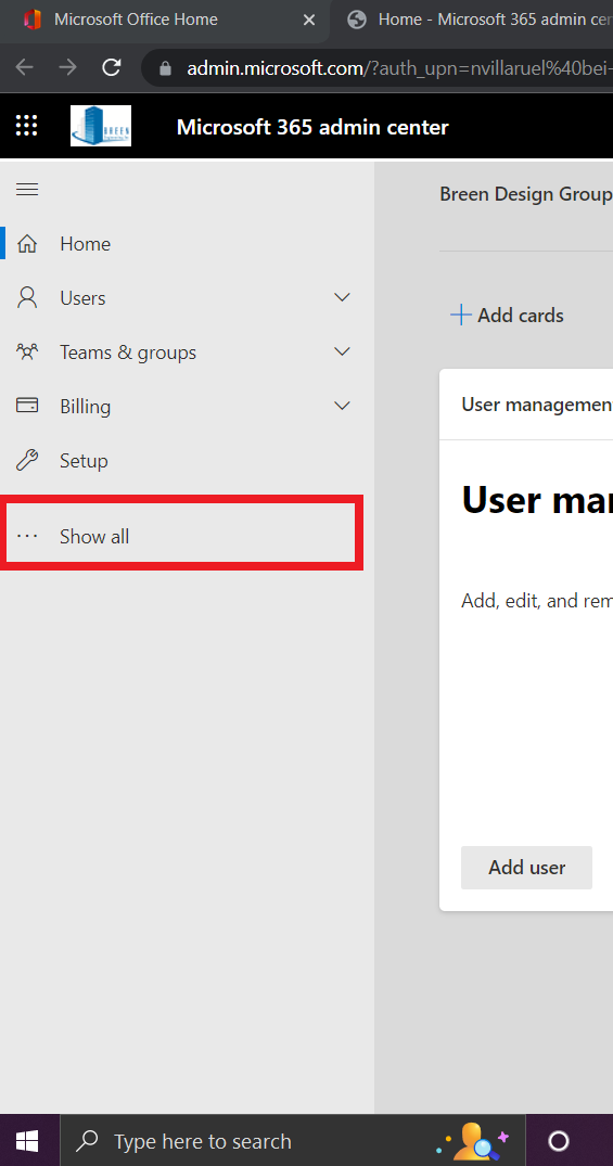 3. Now you're directed to Microsoft 365 Admin Center. On the left side click show all