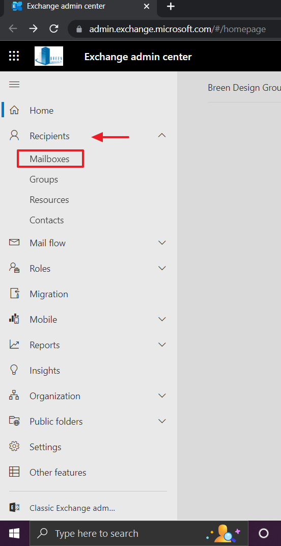 5. Now you're directed to Exchange admin center. On the left side of the window