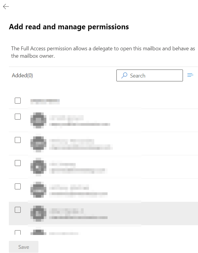 10. Search for the person you want to give full access to the email and click save.