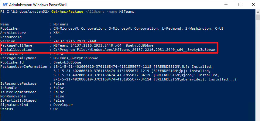 - On the server of the user you are trying to troubleshoot, login as yourself(administrator) and launch an elevated powershell session. Use command Get-AppxPackage -AllUsers -name MSTeams and take note of the "PackageFullName" and the "InstallLocation".