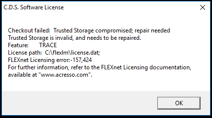 Go to C:\ProgramData\FLEXnet and delete all of the files starting with tranecds_, then restart TRACE and reactivate the license.