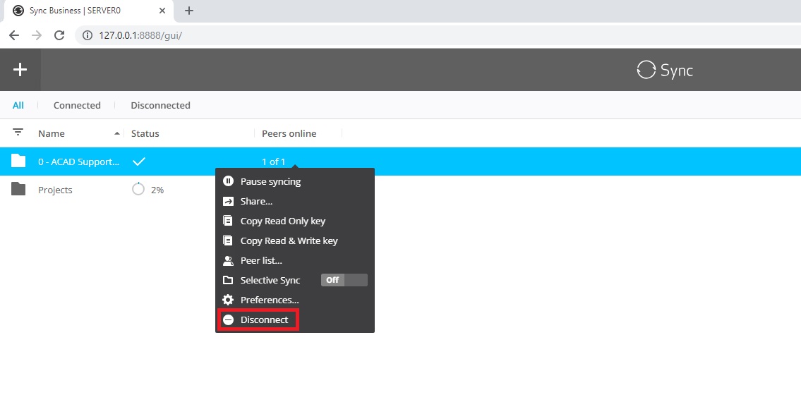 2. Go to both US and SG file servers and login(credentials are written on oneNote) to the web management interface(http://127.0.0.1:8888/gui/) and disconnect the sync of the 0acad support folder