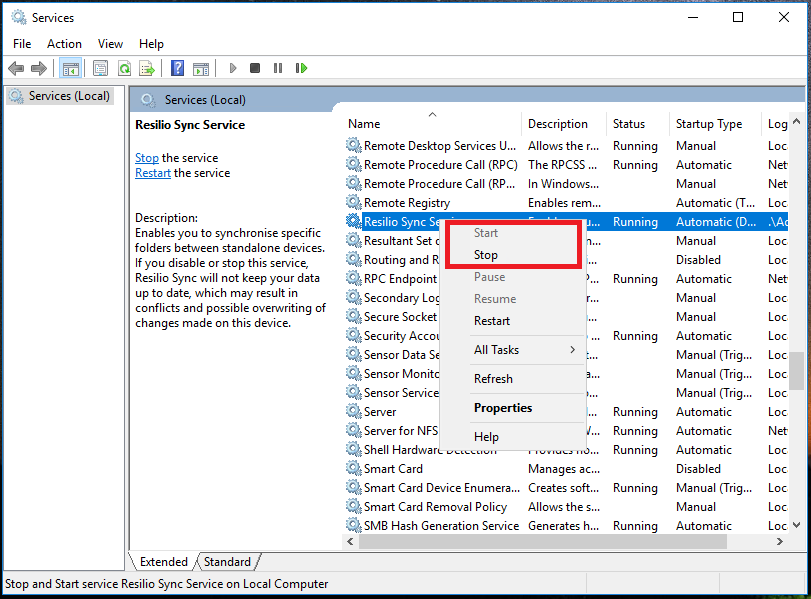3. Use services.msc to stop and start the resilio sync service on both file servers (after stopping the service you may have to use taskkill from a command line with administrative privileges if it is taking too long to stop on one of the servers)