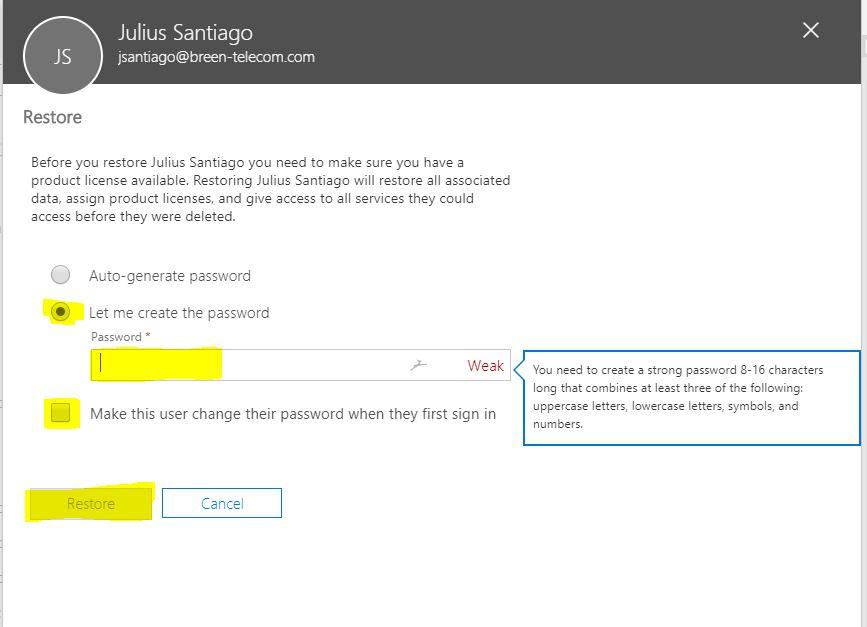 2. To restore, unclick the Make this user change their password when they first sign in, then click the let me create password to have a new password of your own choice then click Restore.