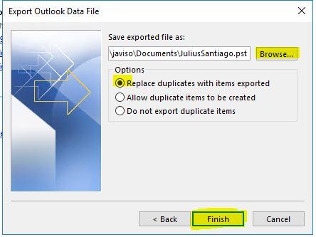 7. You will see that outlook is retrieving the user’s files/email. After the successful retrieving, export the user’s email. Again, go to File > Open & Export > Import/Export > Choose Export to a file > Outlook Date File (.pst) > Choose the recently restored user > Browse on where you want to save the exported user’s files. (Save it with the user’s name. e.g JuliusSantiago) > Select Replace duplicates with items exported (choose this when it’s the 1st time you export the user’s file) / Do not export duplicate items (when you want to continue the exporting process, if interrupted) > Finish. It will at least take 15-25mins to successfully export emails.