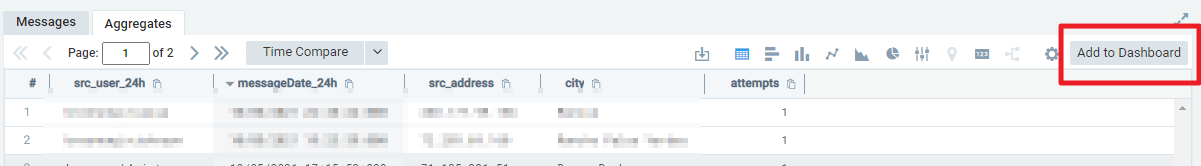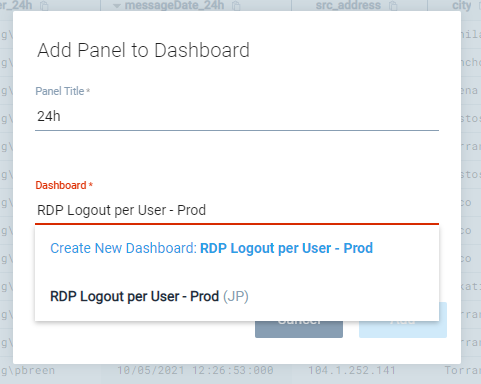 - Once search is complete you can now add it to a panel on a dashboard by clicking Add to dashboard button, add in a Panel Title and either create a new dashboard or add it to a an existing one thru the dropdown