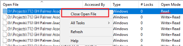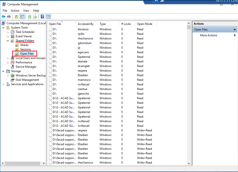 4. On the computer management select shared folders and then select open files.