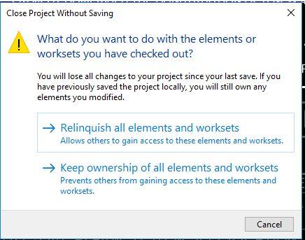 *If upon closing Revit you encounter this prompt, click on Relinquish all elements and worksets