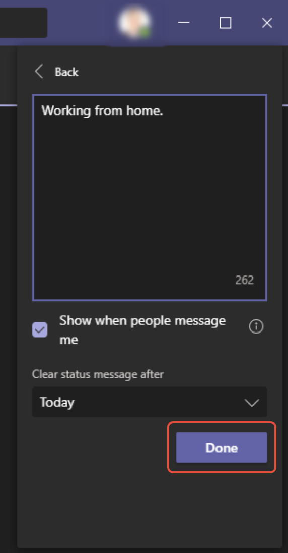 - Type the message that you want to show other people in the box. If you want to show people your status when they message or @mention you, select Show when people message me.