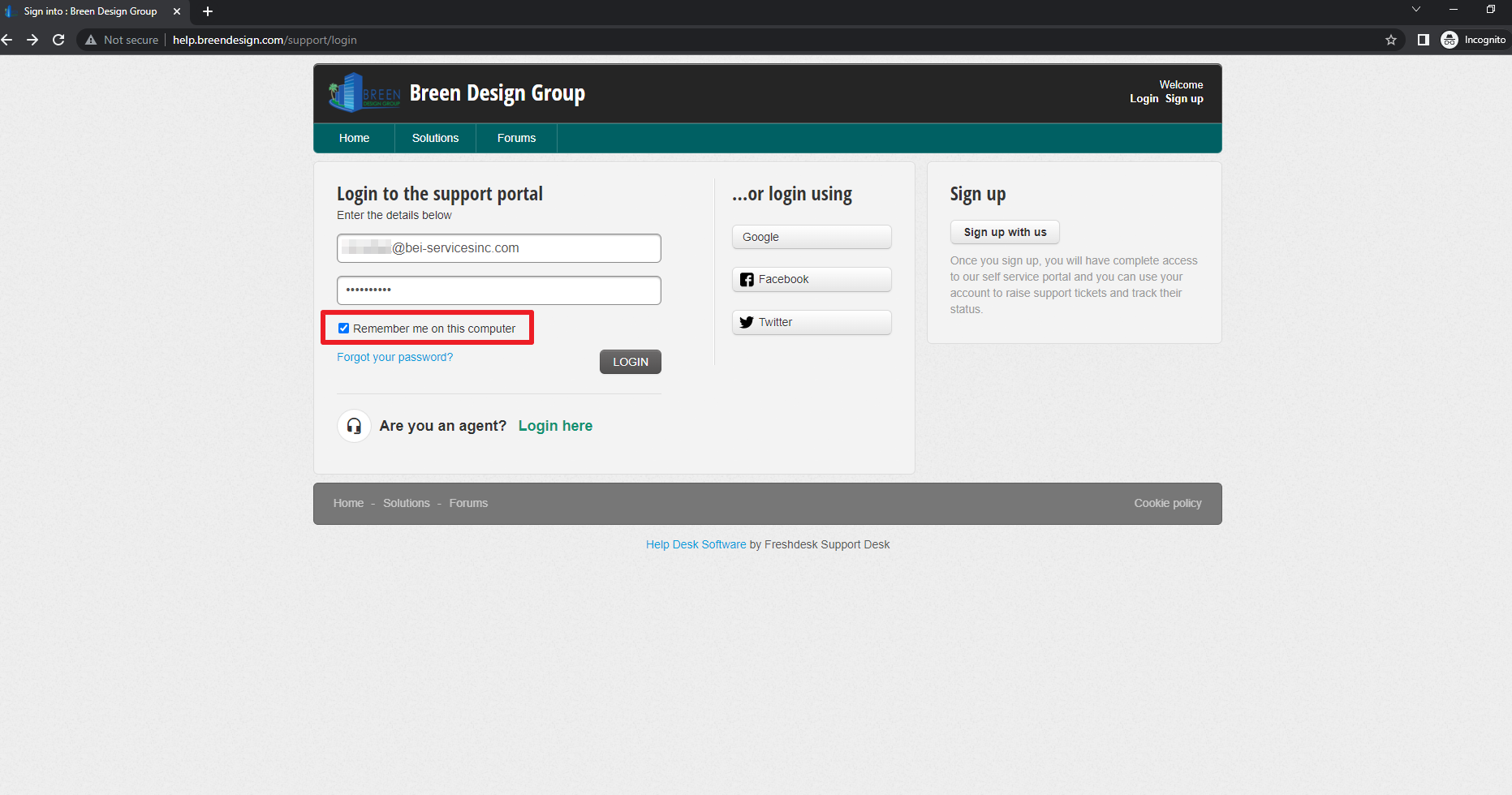 2. Enter your freshdesk credentials and make sure "Remeber me on this computer" is checked to be automatically login.