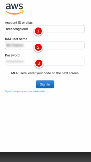 On the next screen, for Account ID or alias, enter breenengcloud and enter your AWS username and password that was provided to you (NOTE: This will most likely be different than your remote desktop or email usernames or passwords):