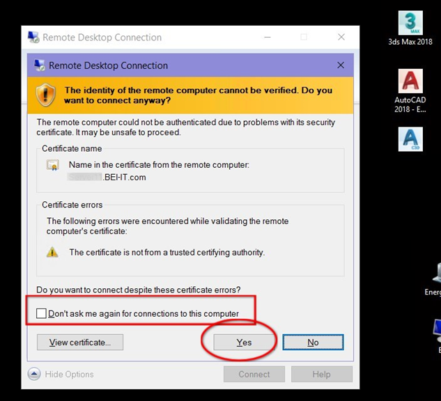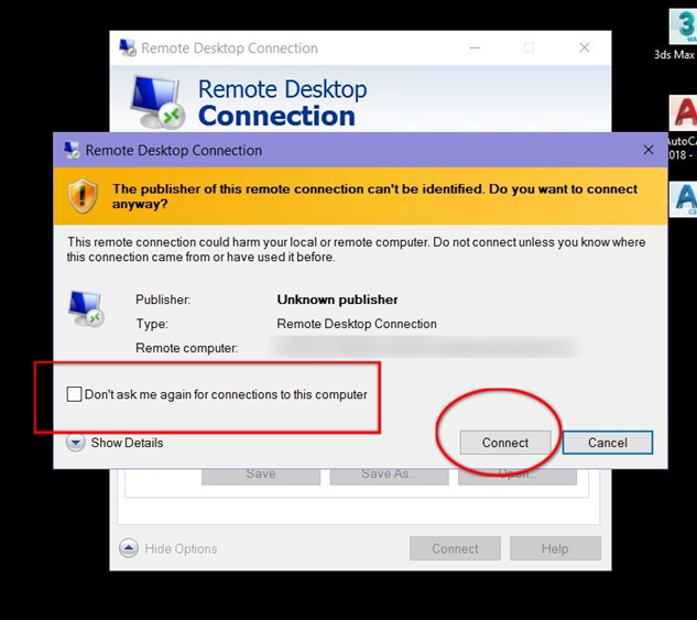After logging in there will be a prompt saying "Do you trust the connection"There will be a check box button saying "Dont ask me again..." check that box and click OK