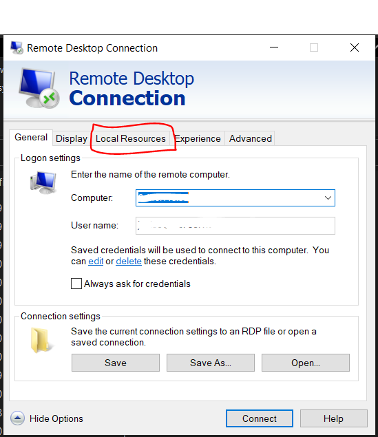 3. On Local Resources Tab, make sure that the Clipboard check box is enabled or checked. This will allow you on copying and pasting files to-and-from your cloud computer/desktop.