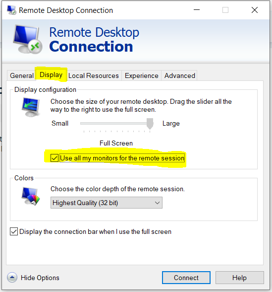 3. Make sure the "Use all my monitors for the remote session" is checked as shown below.